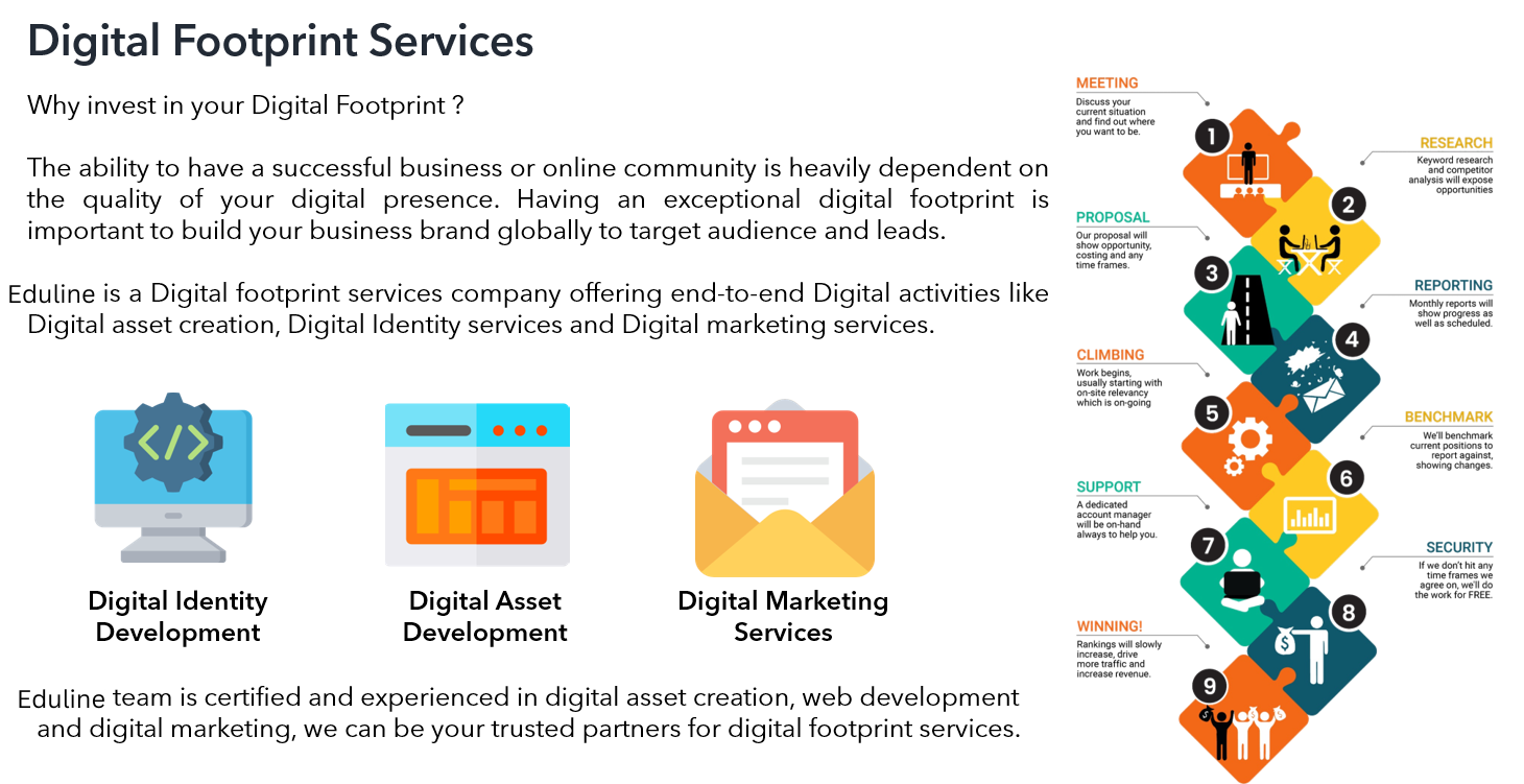 Our Digital Footprint services help to create your product/services portfolio digital assets to engage with your clients offline and online