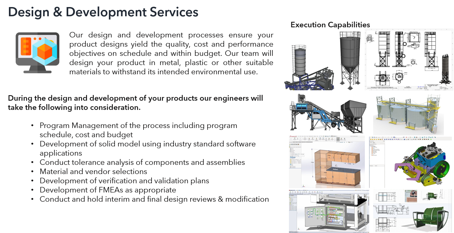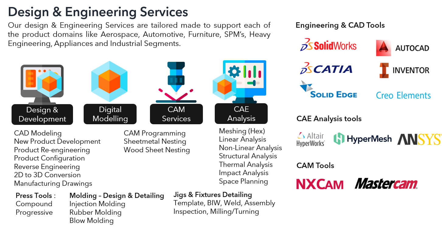 We leverage decades of expertise in CAD, CAM, and CAE, along with very strong domain knowledge in various industry verticals and manufacturing processes, to ensure that clients receive world-class designs.